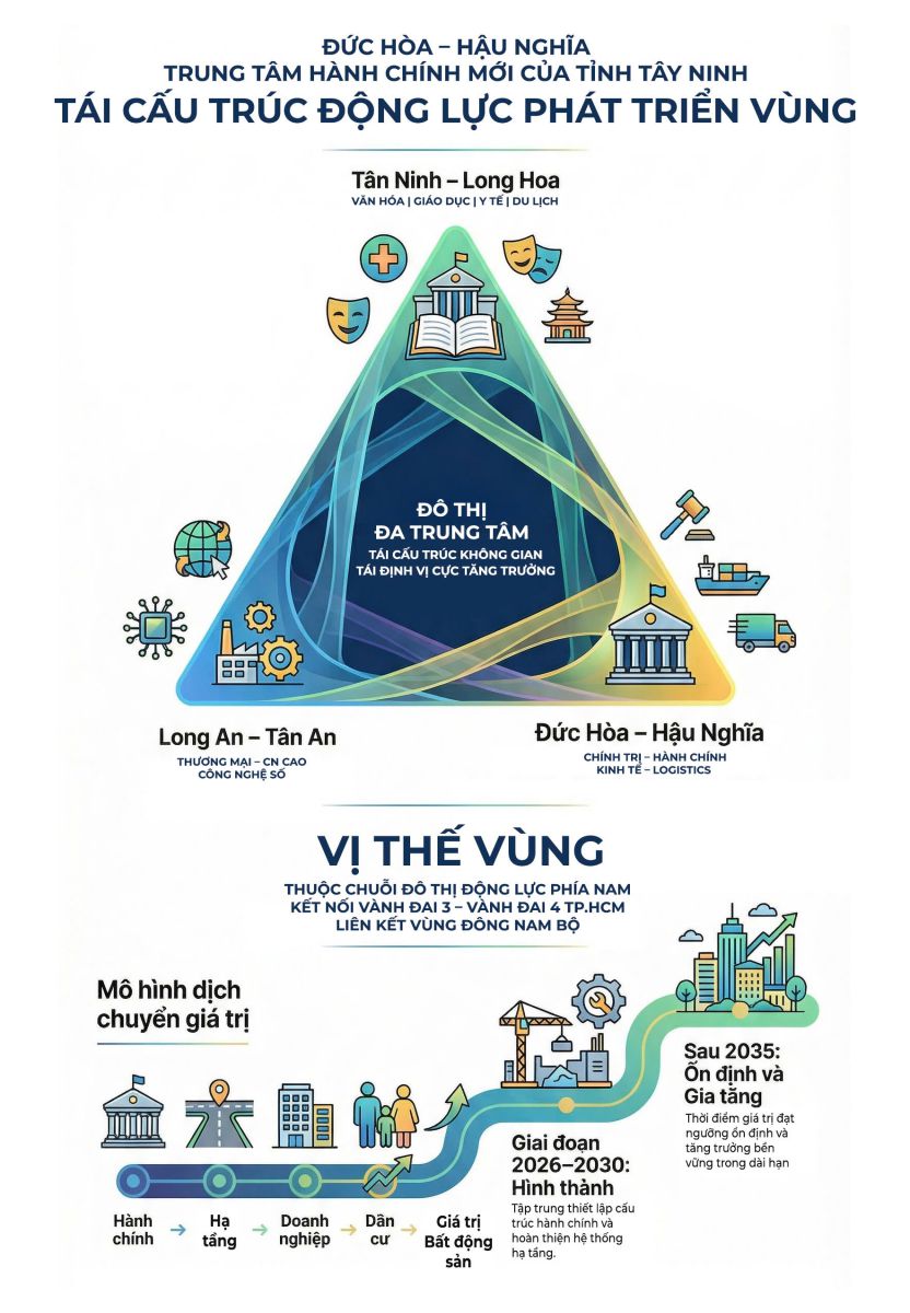 - Khu vực huyện Đức Hòa (cũ) là lựa chọn tối ưu cho trung tâm chính trị - hành chính, trung tâm điều hành, còn TP. Tân An và TP. Tây Ninh là hai “cực chức năng” giúp tỉnh Tây Ninh mới phát triển cân bằng – bền vững – có sức cạnh tranh vùng, đúng tinh thần tổ chức không gian sau sáp nhập.
