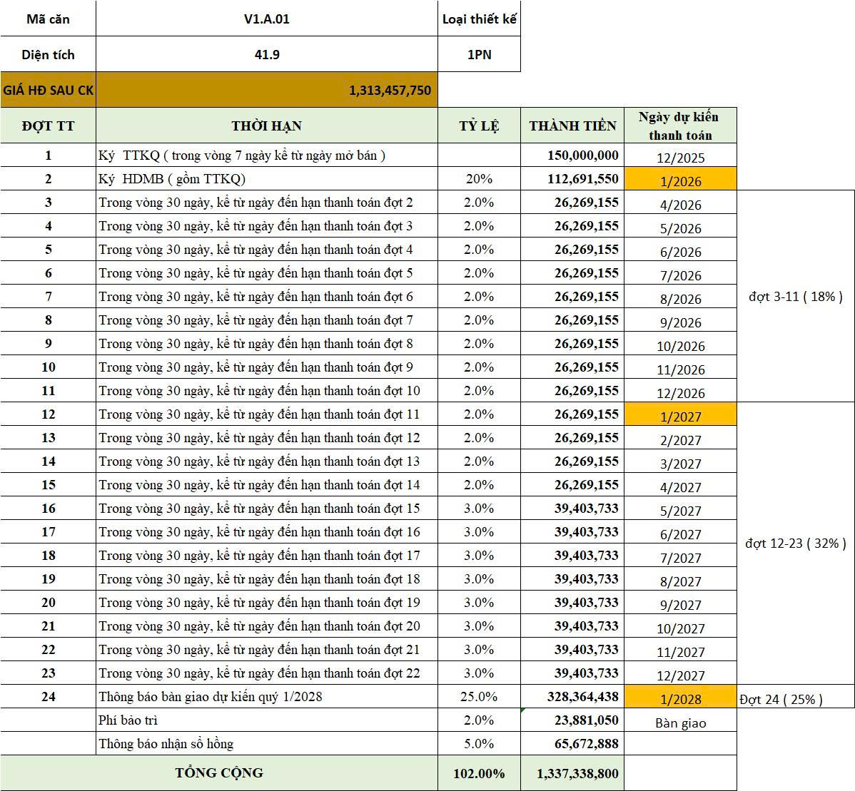 Giá bán & lịch thanh toán tham khảo cho căn 1PN, 1WC, anh chị quan tâm những căn hộ diện tích khác nhắn em qua zalo, viber hoặc liên hệ hotline để em gửi bảng tính chi tiết.