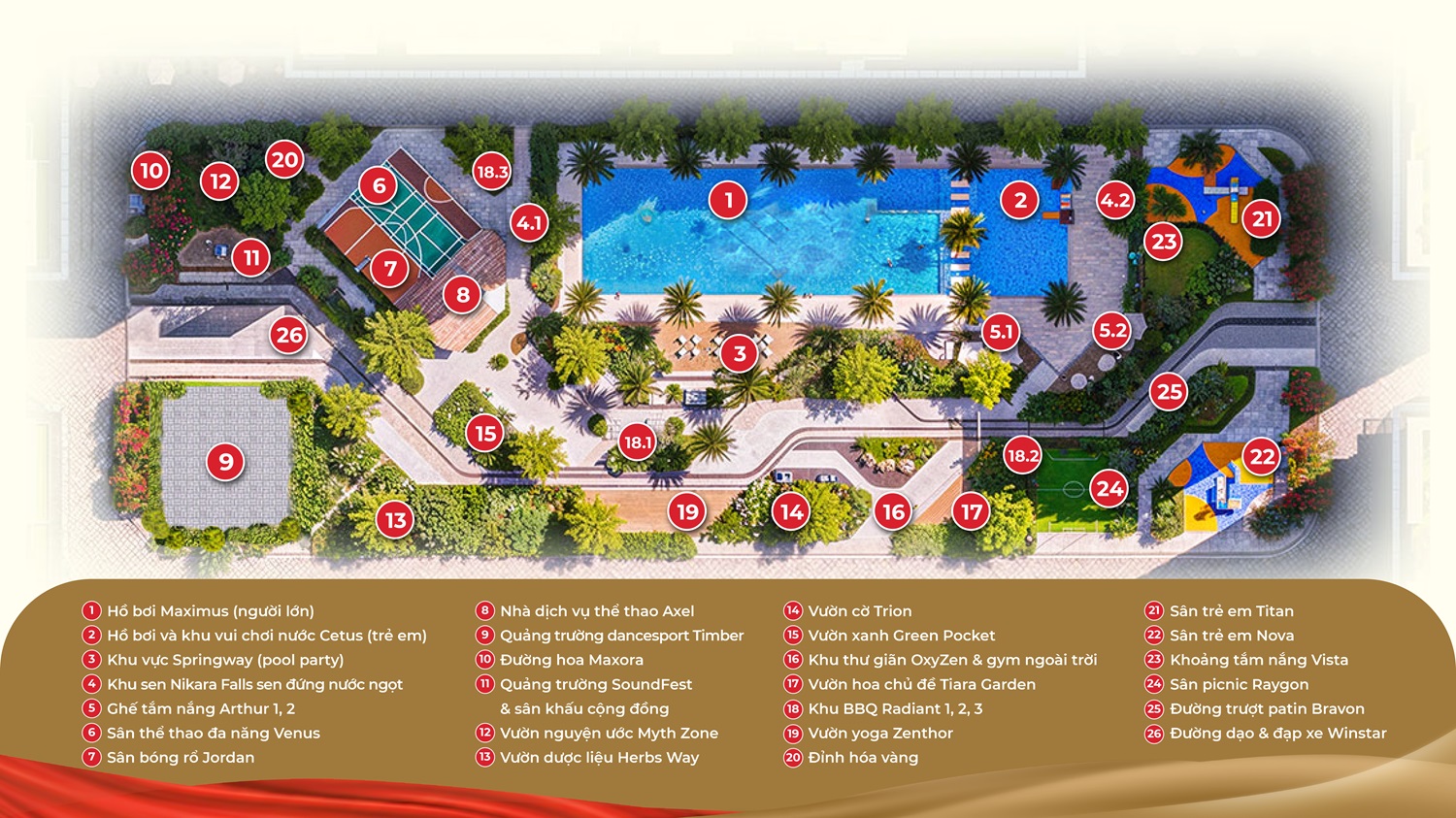 - Quy mô tiện ích: Hơn 1 ha, kết hợp 26+ tiện ích và hồ bơi rộng hơn 700 m2, có chiều dài tiêu chuẩn Olympic.
