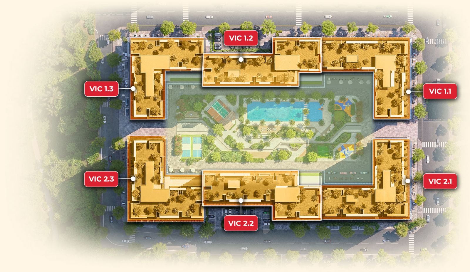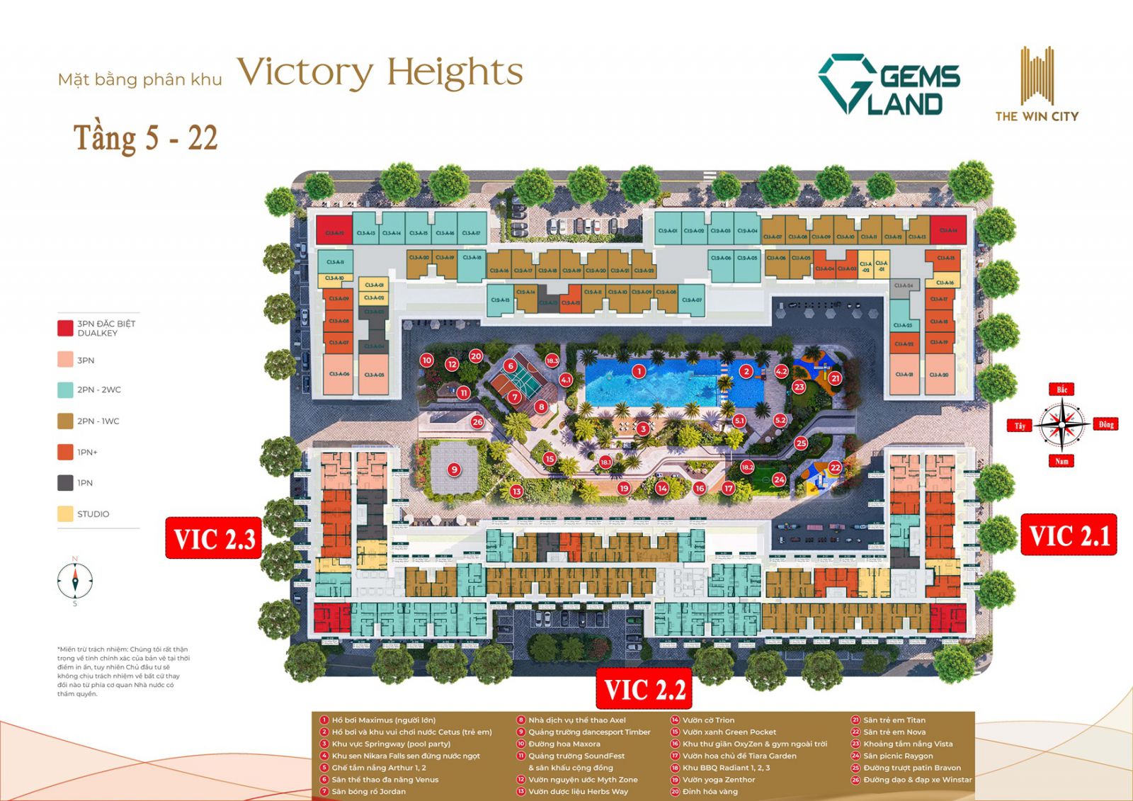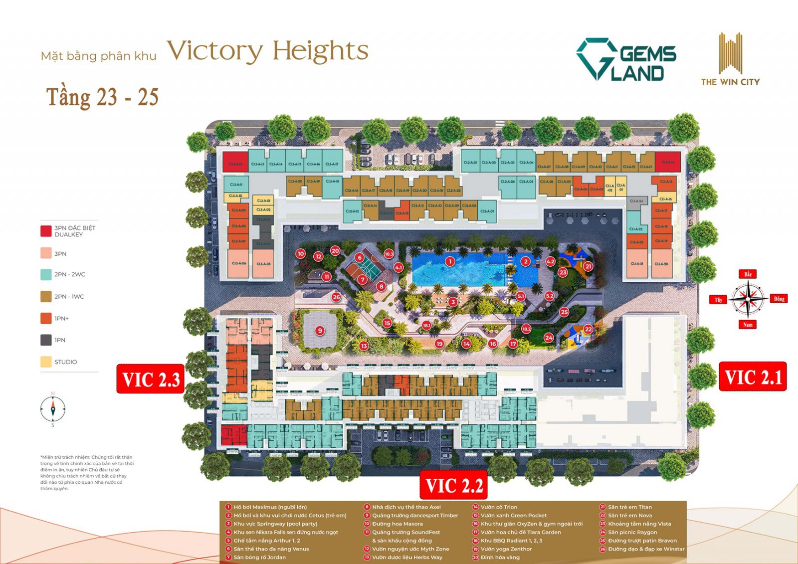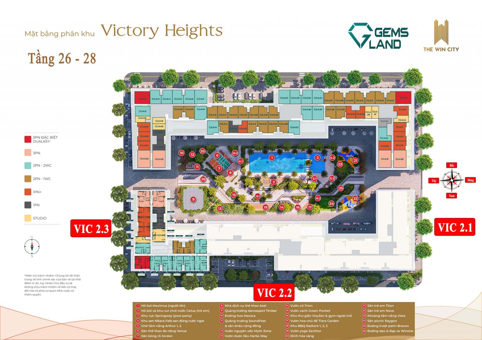 Khu Victory Heights gồm 6 block căn hộ từ Vic 1.1 - Vic 2.3, cao từ 23 – 28 tầng.